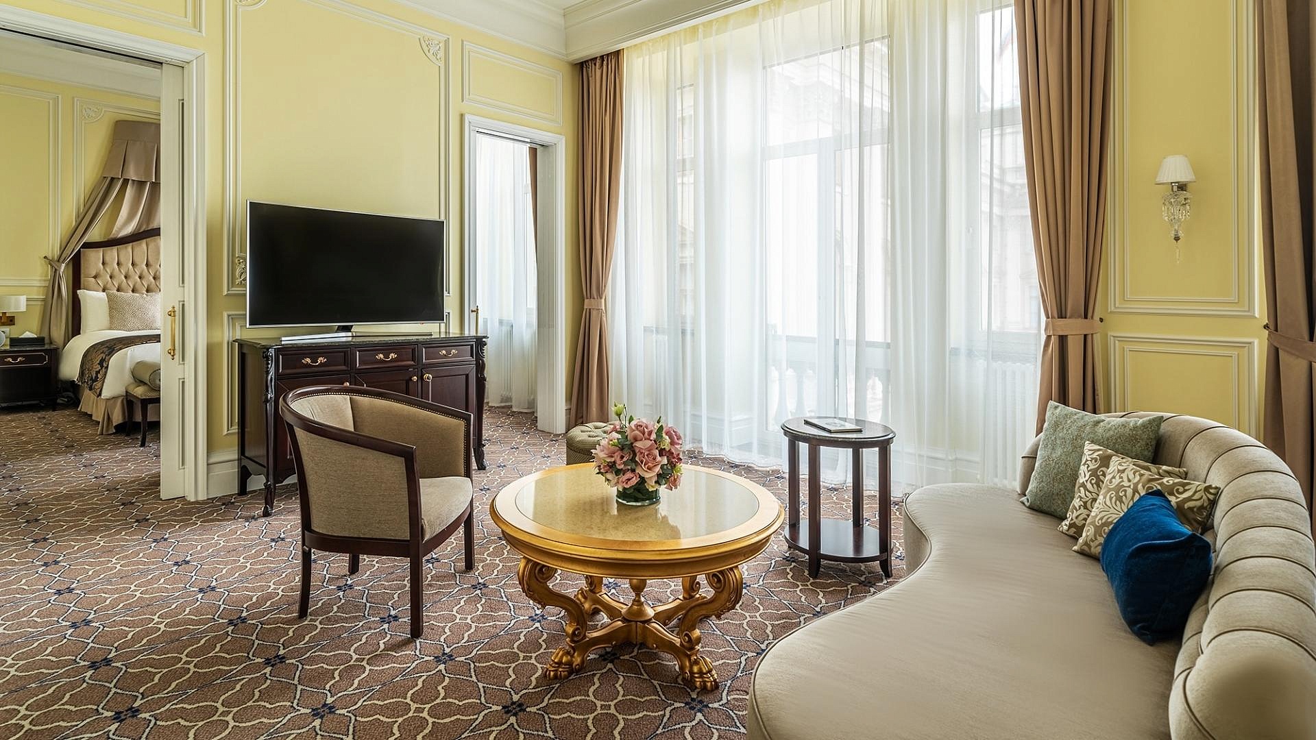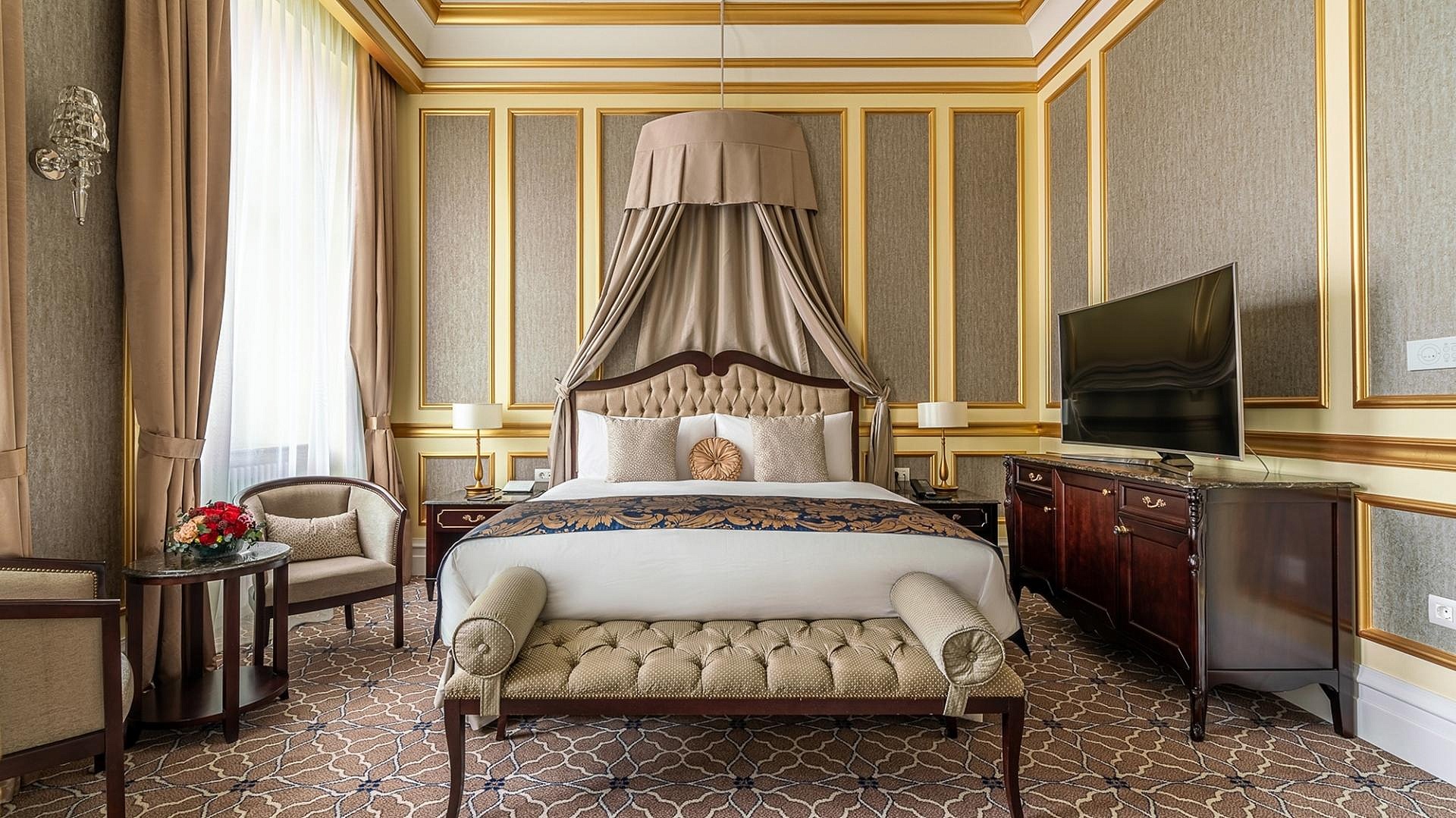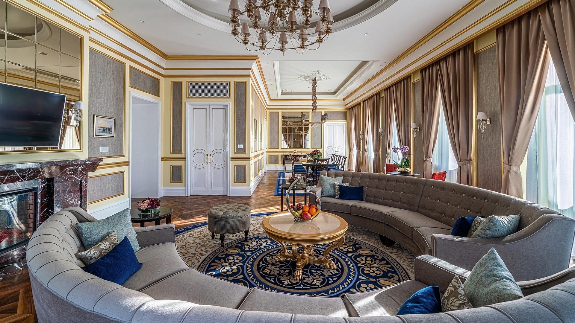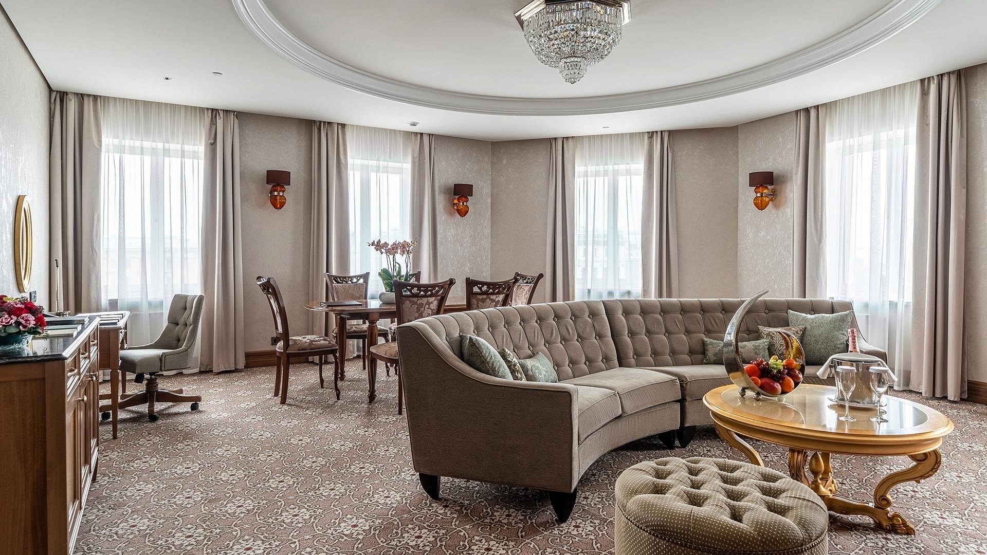 Банкетный зал «Пушкин» с высокими потолками и дневным освещением, оформленный в классическом стиле, идеально подойдет для организации бизнес-мероприятий, свадеб или частных праздников.