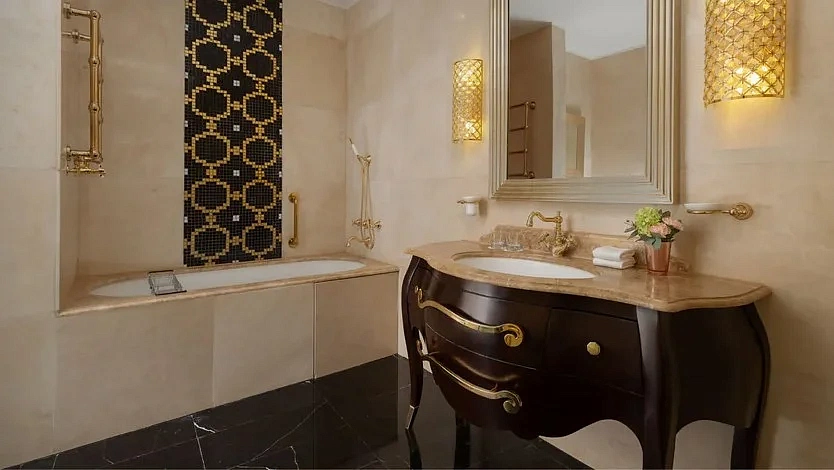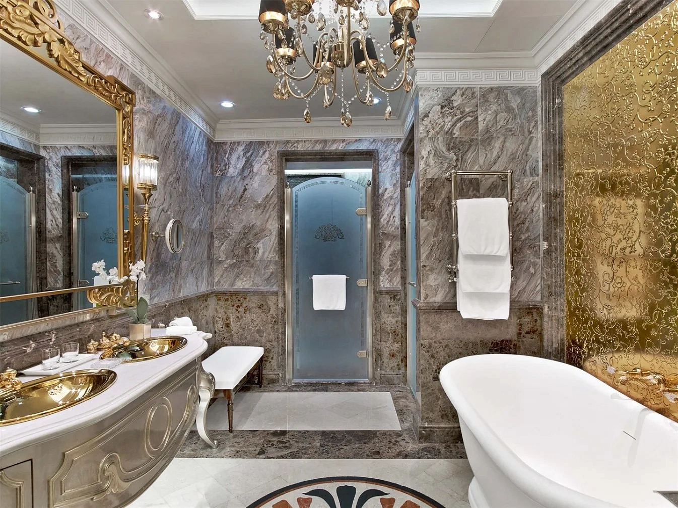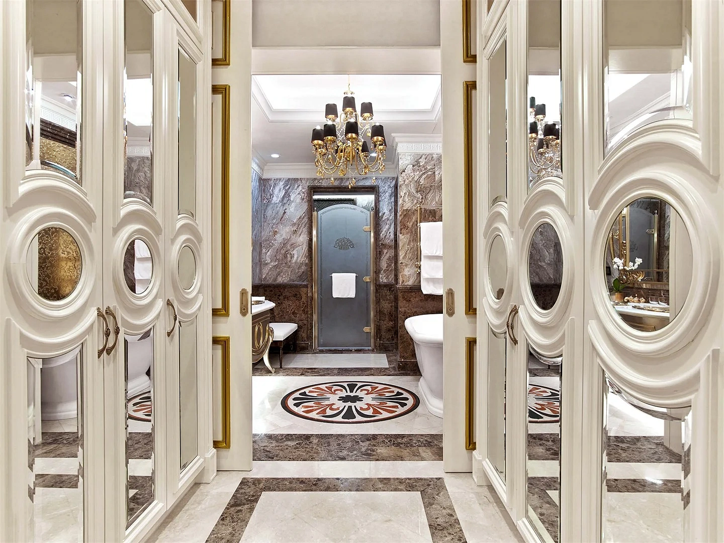 Оформление президентского люкса восхищает золотыми, белыми и бежевыми оттенками, а также использованием материалов высочайшего качества, таких как позолоченный дуб, мрамор, хрусталь и шелк. Эти элементы создают неповторимую атмосферу элегантности, окружающую гостей с первых шагов внутрь.