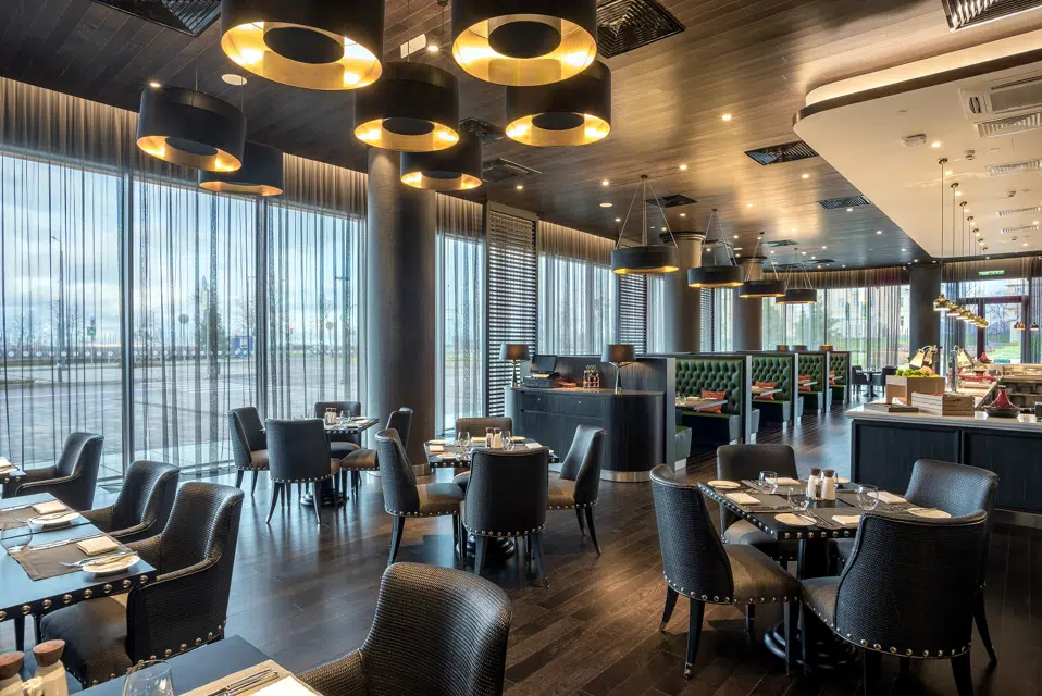 Комментарий экспертаБальный зал с красивым верхним освещением, предусмотрено зонирование по свету, что удобно при делении пространства на секции. При необходимости могут предоставить и смонтировать паркетный танцпол. Перед залом расположен просторный холл, где можно организовать кофе-брейк, однако важно учитывать, что дополнительные столы, кроме уже установленных, не предусмотрены. В ресторане «Гриль» современный интерьер, хорошая мебель и посуда. При этом подача горячего была немного дольше заявленного времени и сложилось ощущение, что официант не всегда ориентируется в меню и составе блюд.