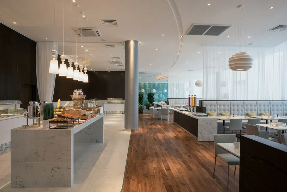 Отель предлагает 17 вариантов кофе-брейков стоимостью от 580 до 1280 рублей на человека. Обед в формате шведского стола — 2250 рублей на человека. При организации обеда пересечения с другими гостями отеля не происходит. Стоимость фуршета — от 4000 рублей, банкета — от 5000 рублей. Пробковый сбор составляет 600 руб. на человека.