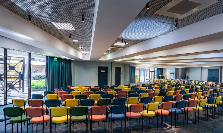 Зал удобно делится перегородками на 3 части, каждую из которых можно использовать под отдельное мероприятие.